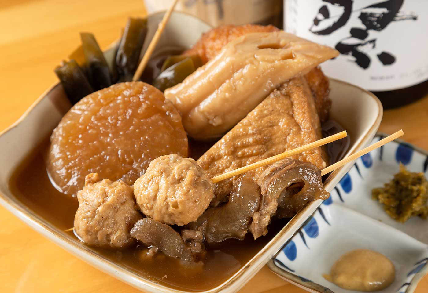 春日部屋台村 満天横丁内にあるおでん居酒屋。おでんを中心に多彩な和食をご提供。店内は、カウンタ―とテーブル席のみ。お酒の種類も多彩で、フランクに立ち寄れるカジュアルさがウリ。お一人様でご来店されるお客様も多数。